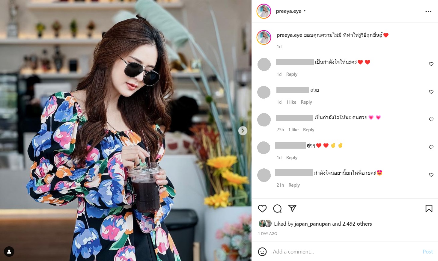 ล่าสุด (21 พฤษภาคม 2565) อาย ปรียานัฐ มีการออกมาเคลื่อนไหวครั้งแรกหลังเกิดดราม่า โดยโพสต์ภาพวันสบาย ๆ ขณะไปเที่ยวคาเฟ่ พร้อมเขียนแคปชั่นสั้น ๆ แต่ความหมายลึกซึ้ง ระบุว่า "ขอบคุณความไม่มี ที่ทำให้รู้วิธีลุกขึ้นสู้"