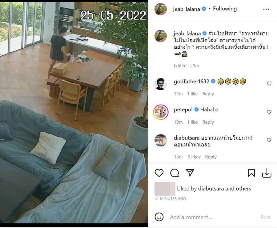 เปิดปริศนาชวนจับตา มาให้เหล่านักสืบโซเชียลได้ทำงานกัน สำหรับ หมอเจี๊ยบ ลลนา ที่ล่าสุด (26 พฤษภาคม 2565) ได้โพสต์คลิปแฟนสาวนั่งกินข้าวอยู่ที่โต๊ะ ก่อนลุกออกไป แล้วพอกลับมาก็งงว่า อาหารที่กินค้างไว้ หายไปไหนหมด พร้อมใส่แคปชั่นว่า "ร่วมไขปริศนา "อาหารที่หายไปในห้องที่เปิดโล่ง" อาหารหายไปได้อย่างไร ? ความจริงมีเพียงหนึ่งเดียวเท่านั้น !"