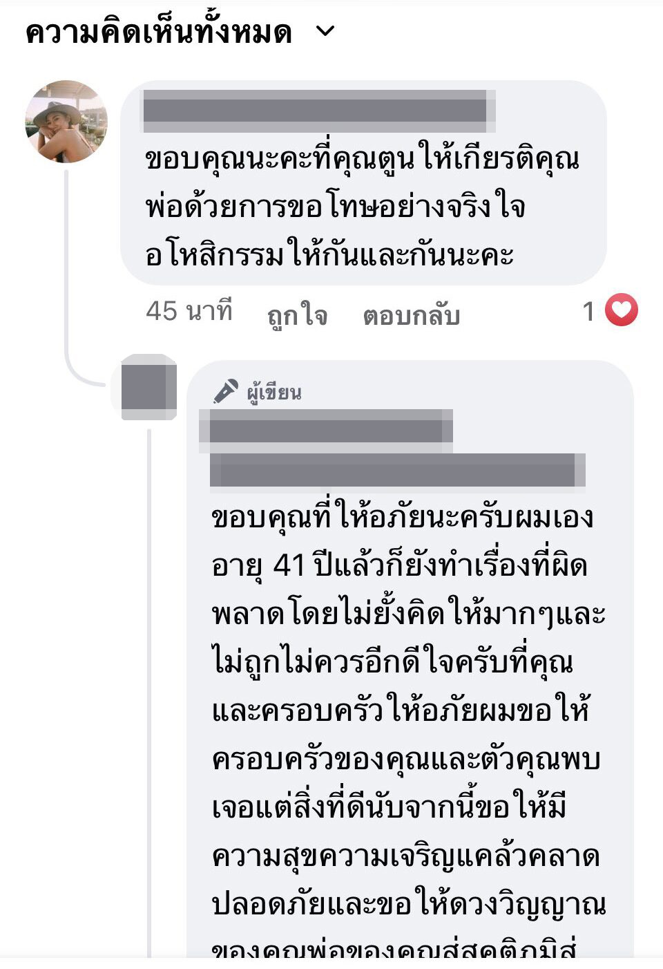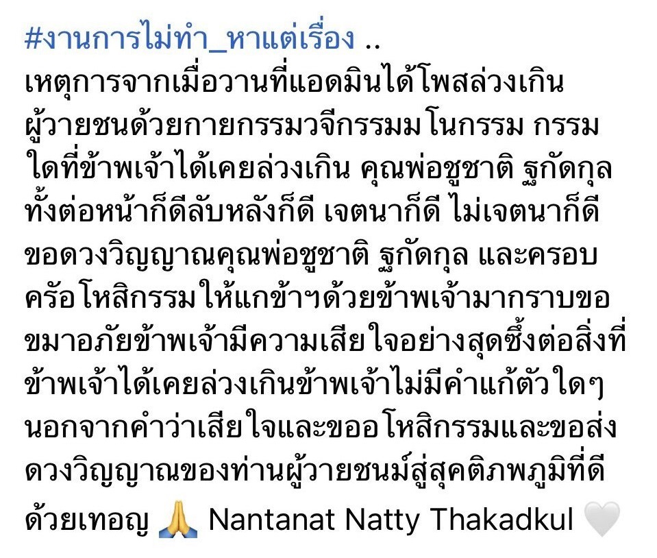 ต่อมาทางเพจได้โพสต์ข้อความขอโทษที่แอดมินโพสต์ล่วงเกิน แม้หลายคนจะบอกให้นัตตี้เอาเรื่อง แต่นัตตี้ก็เข้ามาเขียนคอมเมนต์ตอบกลับทางเพจอย่างไม่ถือโทษว่า "ขอบคุณนะคะที่คุณตูนให้เกียรติคุณพ่อด้วยการขอโทษอย่างจริงใจ อโหสิกรรมให้กันและกันนะคะ"