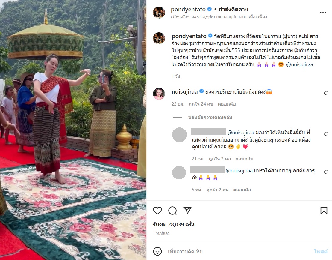 ขณะที่ นุ้ย สุจิรา ก็เข้ามาคอมเมนต์ถึงคุณสามีว่า "ลงควรปรึกษาเมียนิดนึงนะคะ" พร้อมแปะอีโมจิรูปหน้าตกใจ ซึ่งก็มีแฟน ๆ เข้ามาร่วมอนุโมทนาบุญอย่างมากมาย แถมชื่นชมการรำของนุ้ยด้วยว่างดงามมาก