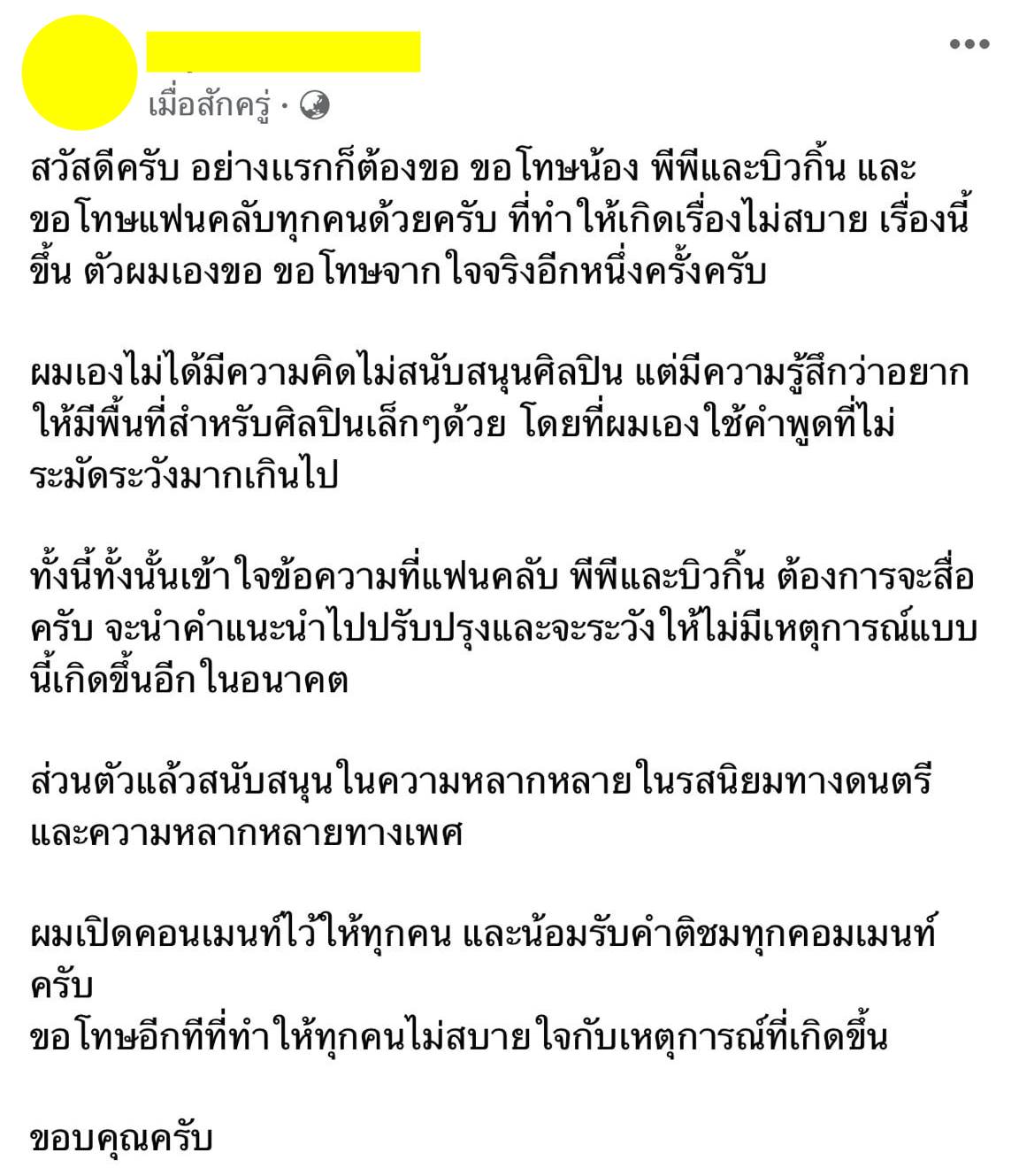 "ผมเปิดคอนเมนต์ไว้ให้ทุกคน และน้อมรับคำติชมทุกคอมเมนท์ครับ ขอโทษอีกทีที่ทำให้ทุกคนไม่สบายใจกับเหตุการณ์ที่เกิดขึ้น"