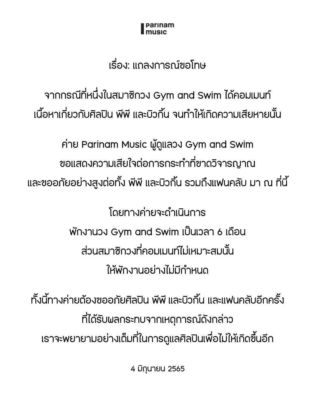 ต่อมา เฟซบุ๊ก Parinam Music ค่ายต้นสังกัดของวง Gym and Swim ได้ออกแถลงการณ์ขอโทษ และลงโทษวงดังกล่าวด้วยการพักงานเป็นเวลา 6 เดือน ส่วนมือกีตาร์ของวงที่เป็นคนโพสต์ข้อความนั้นจะถูกพักงานอย่างไม่มีกำหนด