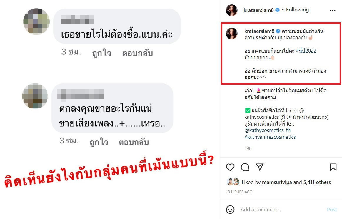 ทั้งนี้หลายคนเข้ามาให้กำลังใจกระแตและติงคนที่มาคอมเมนต์ด่าว่า ถ้าไม่ชอบ ไม่อยากดู ก็ให้เลื่อนผ่านไป คนเขาทำมาหากิน ไม่อยากซื้อ ไม่ถูกใจ ก็ไม่ต้องมาว่ากันเสีย ๆ หาย ๆ แบบนี้