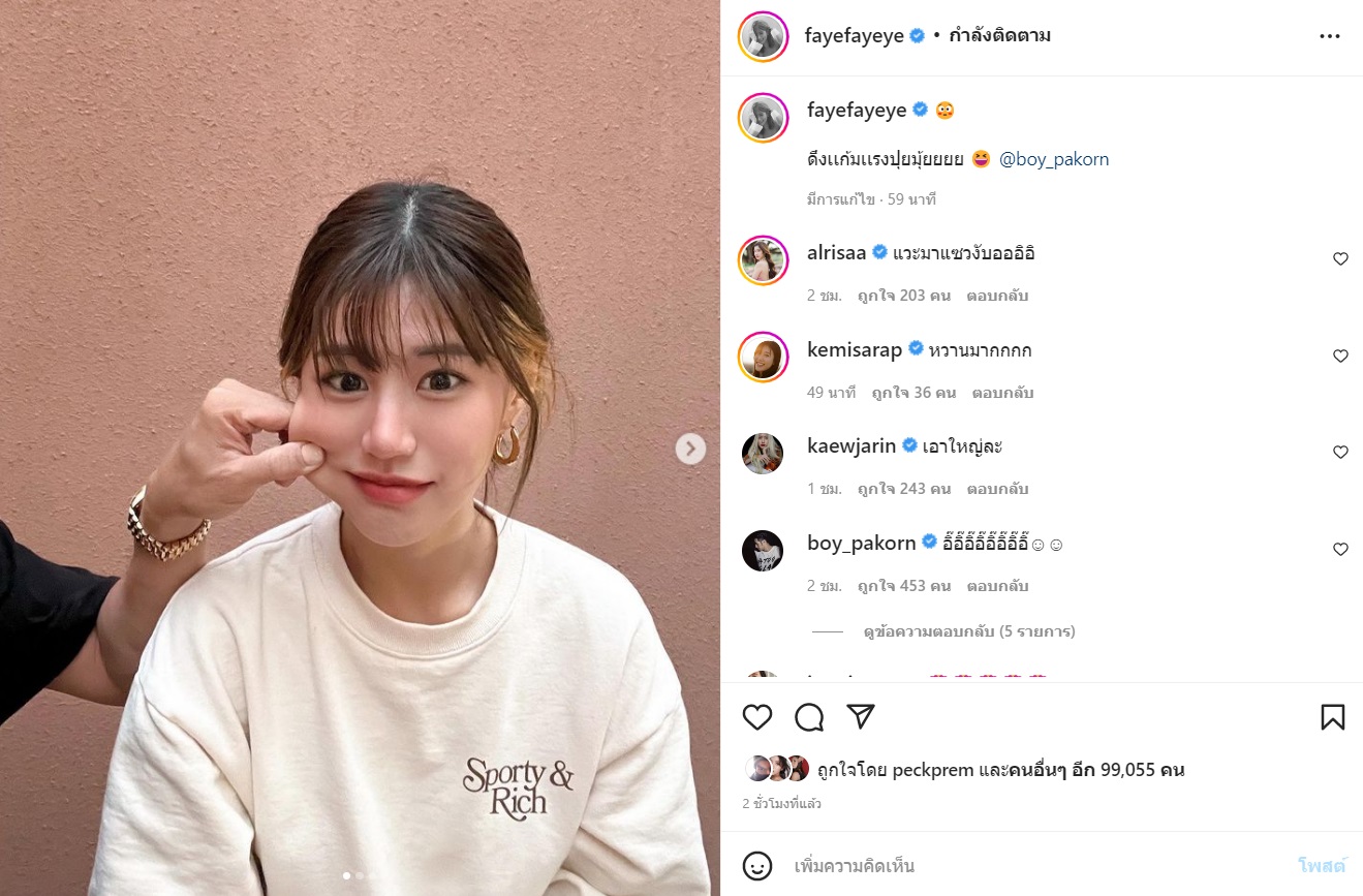 ล่าสุด (7 มิถุนายน 2565) บอยและเฟย์มีการนำภาพน่ารัก ๆ ขณะหยอกเย้ากันไป-มาโพสต์ลงอินสตาแกรมให้ชม มีหยิกแก้มบ้าง เอามือรองใต้คางทำท่าอุ๋งตกหัวใจบ้าง ฟินจิกหมอนสุด ๆ