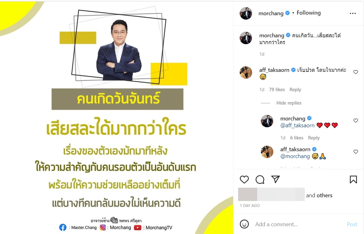 งานนี้นางเอกสาว แอฟ ทักษอร ที่เกิดวันจันทร์เช่นกัน ก็เข้ามาคอมเมนต์ที่โพสต์ดังกล่าว บอกว่า "เจ็บปวด โดนใจมากค่ะ" กับอีโมจิยิ้มแห้ง ทำเอา หมอช้าง ต้องปาหัวใจกลับ ซึ่งสาวแอฟก็ส่งอีโมจิยิ้มแห้งกลับ พร้อมอีโมจิยกมือไหว้