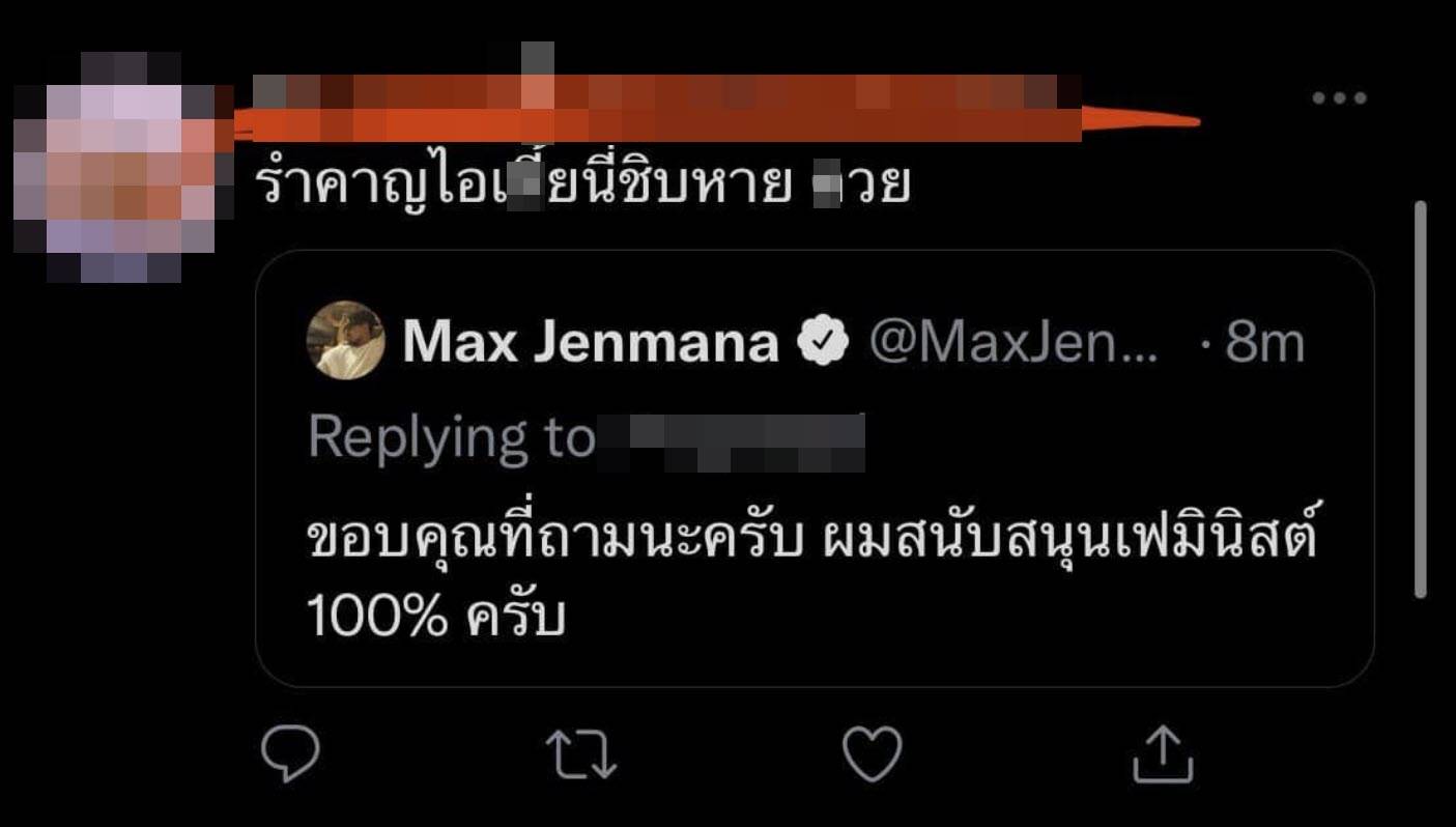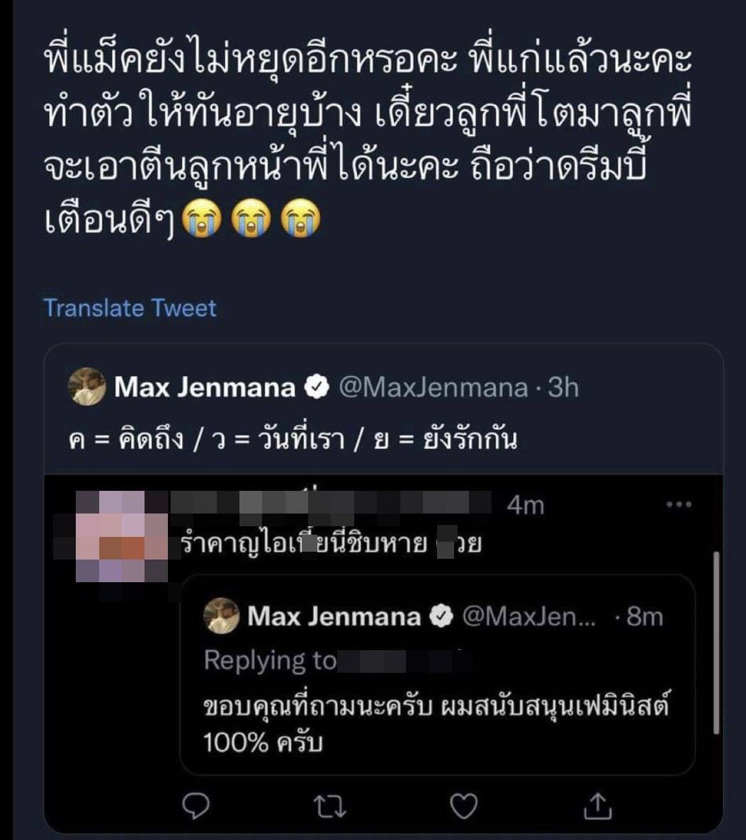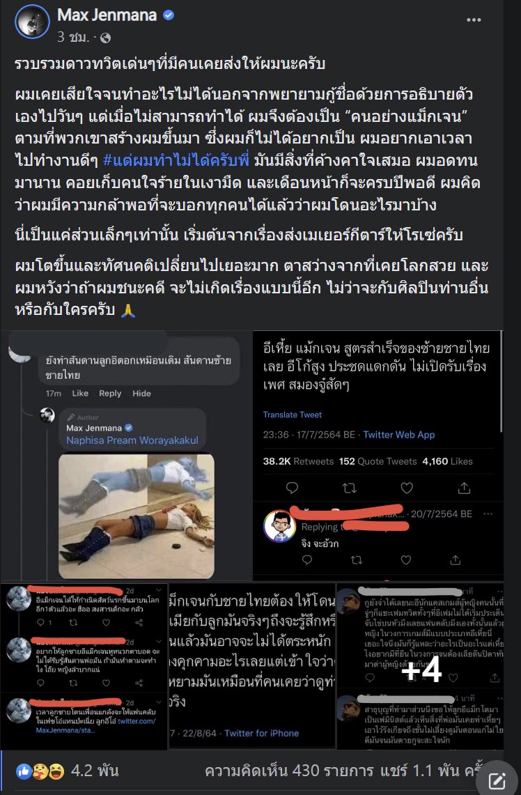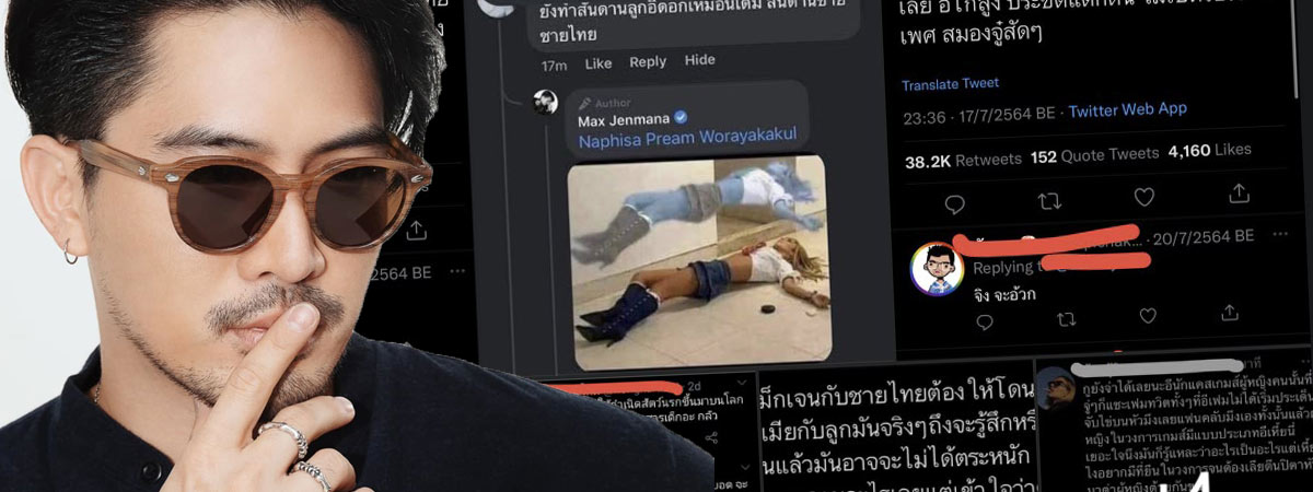 ขณะเดียวกัน แม็กซ์ เผยตัวอย่างข้อความที่ถูกโจมตีในโลกออนไลน์อย่างรุนแรง พร้อมระบุว่า “รวบรวมดาวทวิตเด่น ๆ ที่มีคนเคยส่งให้ผมนะครับ ผมเคยเสียใจจนทำอะไรไม่ได้นอกจากพยายามกู้ชื่อด้วยการอธิบายตัวเองไปวัน ๆ แต่เมื่อไม่สามารถทำได้ ผมจึงต้องเป็น “คนอย่างแม็กเจน” ตามที่พวกเขาสร้างผมขึ้นมา ซึ่งผมก็ไม่ได้อยากเป็น ผมอยากเอาเวลาไปทำงานดี ๆ #แต่ผมทำไม่ได้ครับพี่ มันมีสิ่งที่ค้างคาใจเสมอ ผมอดทนมานาน คอยเก็บคนใจร้ายในเงามืด และเดือนหน้าก็จะครบปีพอดี ผมคิดว่าผมมีความกล้าพอที่จะบอกทุกคนได้แล้วว่าผมโดนอะไรมาบ้าง