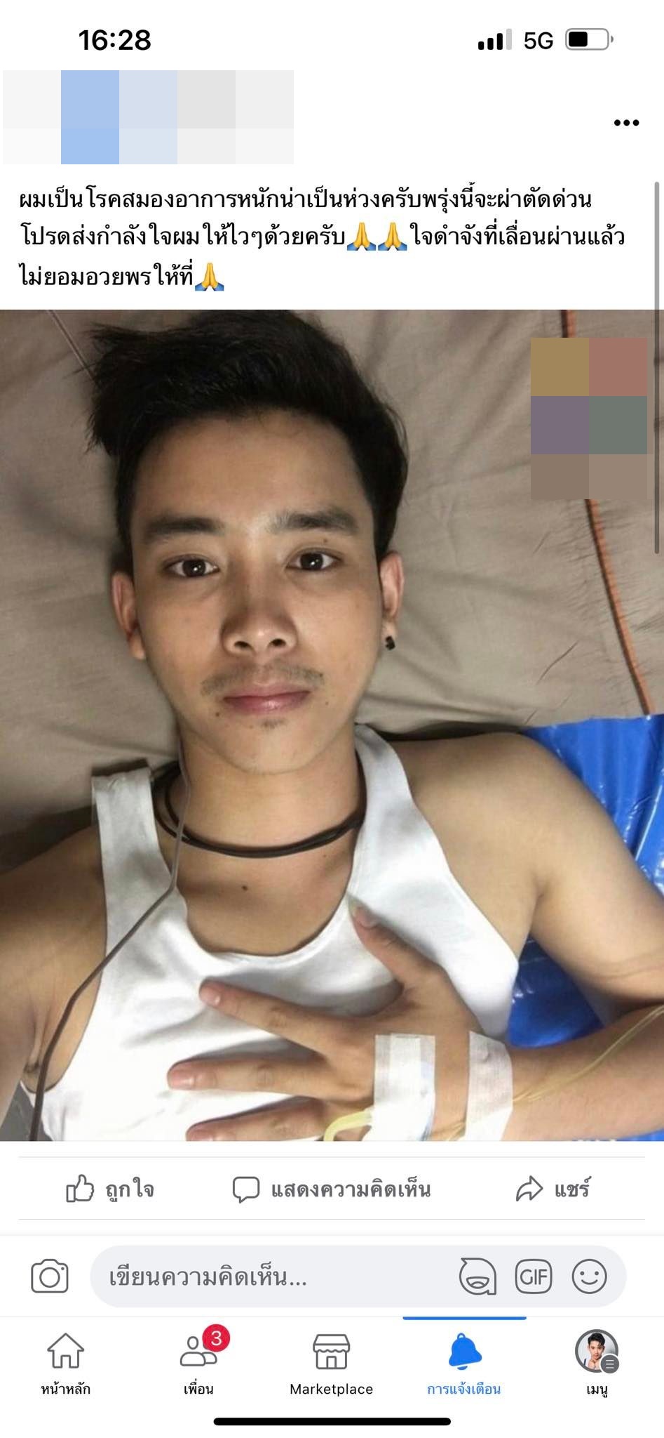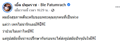 "ผมยังสุขภาพดีนะครับขอบพระคุณทุกคนที่เป็นห่วง แต่ว่า เพจไม่น่ารักเลย ว่าป่วยไม่เท่าไหร่ แต่รูปสมัยนั้นน่าจะปรึกษากันก่อนจะได้ส่งรูปสมัยปัจจุบันให้"