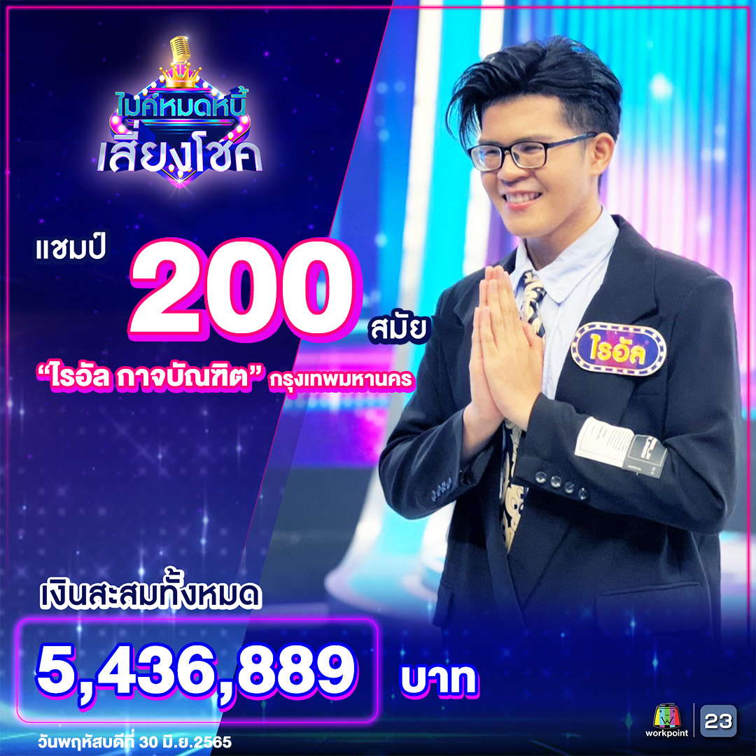 และล่าสุดในรายการ ไมค์หมดหนี้ วันที่ 30 มิถุนายน 2565 ไรอัล กาจบัณฑิต แชมป์ที่สร้างประวัติศาสตร์ครองแชมป์ยาวนาน 200 สมัย บนเวทีไมค์หมดหนี้ และได้เงินรางวัลสะสมกว่า 5,436,889 บาท ไรอัลได้ก้มกราบพื้นเวที พร้อมทั้งประกาศสละตำแหน่งแชมป์แล้ว เพื่อให้โอกาสคนอื่นได้ขึ้นมาเป็นแชมป์แทน งานนี้ทำเอาคณะกรรมการ พิธีกร ต่างพากันร้องไห้ปล่อยโฮกลางห้องส่ง