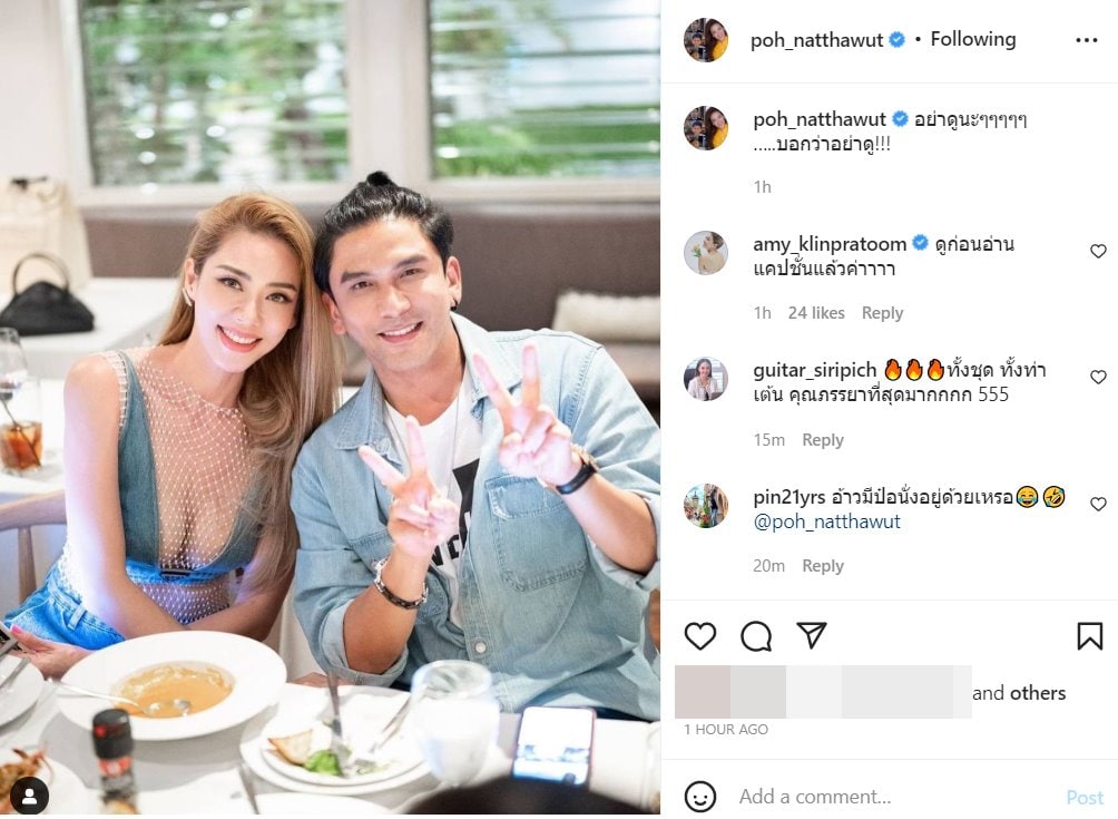 งานนี้แม้ว่าหนุ่มป๋อจะลงแคปชั่นดักไว้ว่า "อย่าดูนะ ๆๆๆๆๆ …..บอกว่าอย่าดู !!!" ด้วยความหวงภรรยา แต่ก็ห้ามไม่ทันจริง ๆ เพราะแค่เห็นรูปก็แทบจะมองข้ามแคปชั่นกันหมดแล้ว ขณะที่ IG ของสาวเอ๋ ก็มีลงภาพเซตนี้ด้วยเช่นกัน ทำแฟน ๆ เข้ามากดไลก์กันรัว ๆ