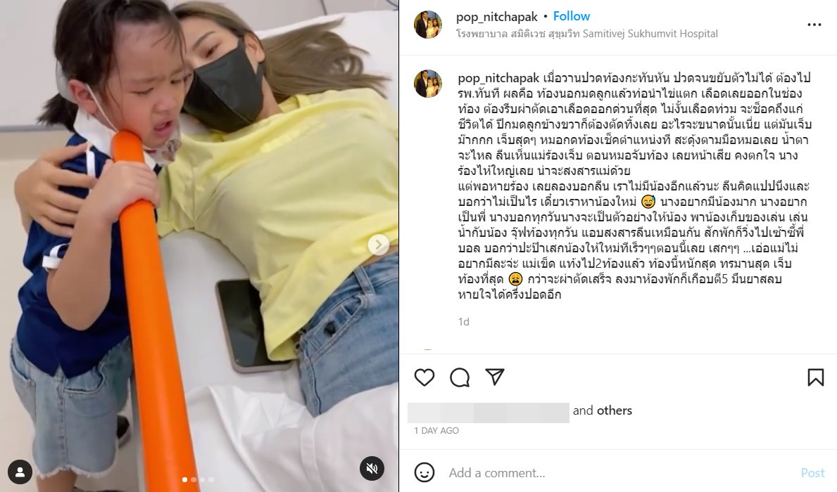 "เมื่อวานปวดท้องกะทันหัน ปวดจนขยับตัวไม่ได้ ต้องไป รพ. ทันที ผลคือ ท้องนอกมดลูกแล้วท่อนำไข่แตก เลือดเลยออกในช่องท้อง ต้องรีบผ่าตัดเอาเลือดออกด่วนที่สุด ไม่งั้นเลือดท่วม จะช็อกถึงแก่ชีวิตได้ ปีกมดลูกข้างขวาก็ต้องตัดทิ้งเลย อะไรจะขนาดนั้นเนี่ย แต่มันเจ็บม๊ากกก เจ็บสุด ๆ หมอกดท้องเช็กตำแหน่งที สะดุ้งตามมือหมอเลย น้ำตาจะไหล ลีนเห็นแม่ร้องเจ็บ ตอนหมอจับท้อง เลยหน้าเสีย คงตกใจ นางร้องไห้ใหญ่เลย น่าจะสงสารแม่ด้วย