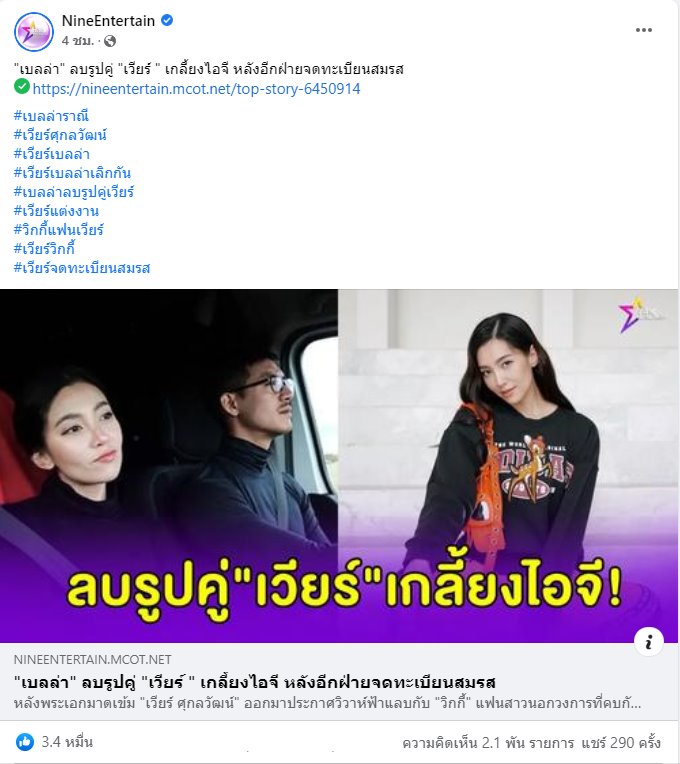 ยังคงถูกจับตาอยู่ตอนนี้ สำหรับความเคลื่อนไหวของนางเอกสาว เบลล่า ราณี หลังอดีตคนรัก เวียร์ ศุกลวัฒน์ ประกาศเตรียมแต่งงานกับแฟนสาวนอกวงการ วิกกี้ หลังคบมาปีกว่า ซึ่งก็มีข่าวออกมาว่า เบลล่า ได้ลบรูปคู่กับเวียร์ออกจาก IG จนเกลี้ยงแล้ว หลังอีกฝ่ายจดทะเบียนสมรสกับแฟนสาว