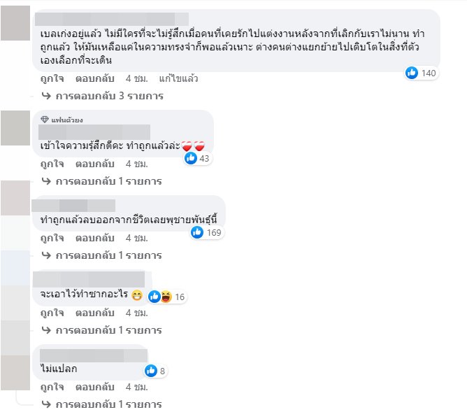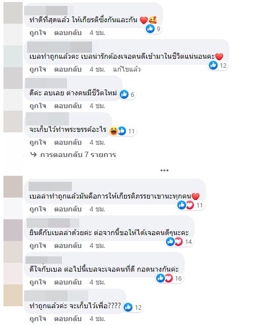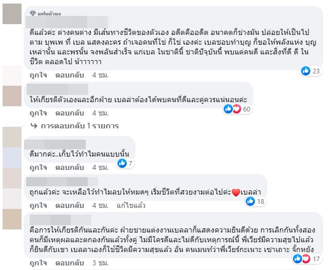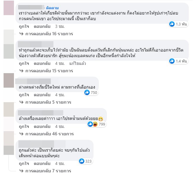 บ้างก็มองว่า ถ้าเป็นเราเองก็ลบ เพราะจบไปแล้ว เดินหน้าต่อไปแบบมั่น ๆ มูฟออนได้ บ้างก็บอกดีใจกับเบลล่าด้วย ทำแบบนี้คือดีแล้ว เป็นการให้เกียรติทุกฝ่าย ถ้าเลิกกันแล้ว จะลบรูปคู่ ก็เป็นเรื่องปกติ