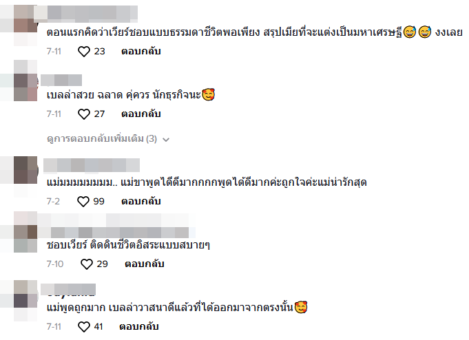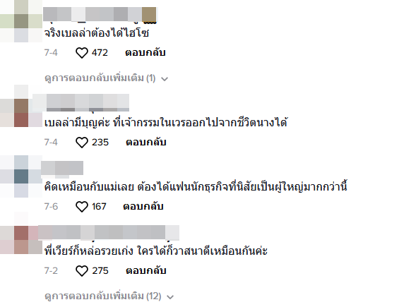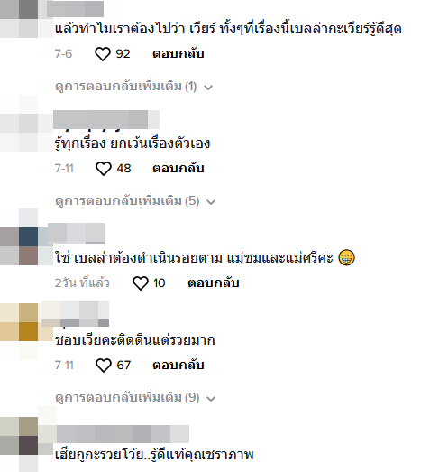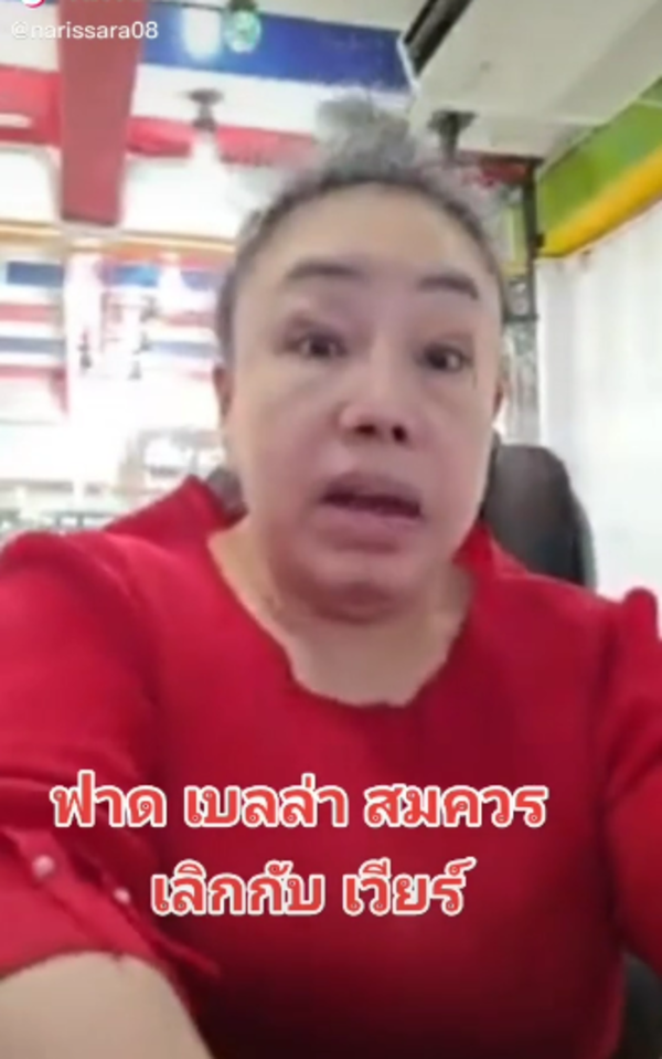 ฉันมองแล้วเขาไม่เหมาะกัน เวียร์ก็แก่ลงทุกวัน ลงทุนขายไก่ก็เจ๊ง เขาไม่เหมาะกัน ยินดีกับเบลล่าควรมีควรได้ผัวรวย ๆ เป็นมหาเศรษฐี เขาสวย เก่ง เบลล่ารวยนะมีเงินเป็นพันล้านบอกให้รู้ไว้ นางใจบุญด้วย ชอบทำบุญ ชอบช่วยเหลือสังคม สมควรได้สามีรวย ๆ แบบชมพู่ อารยา เวียร์แก่แล้วจะเป็นพระเอกได้กี่ปี พักหลังเล่นละครก็ไม่ดัง ผัวเนี่ยสำคัญ ต้องเลือกนักธุรกิจจะได้ประสบความสำเร็จ"