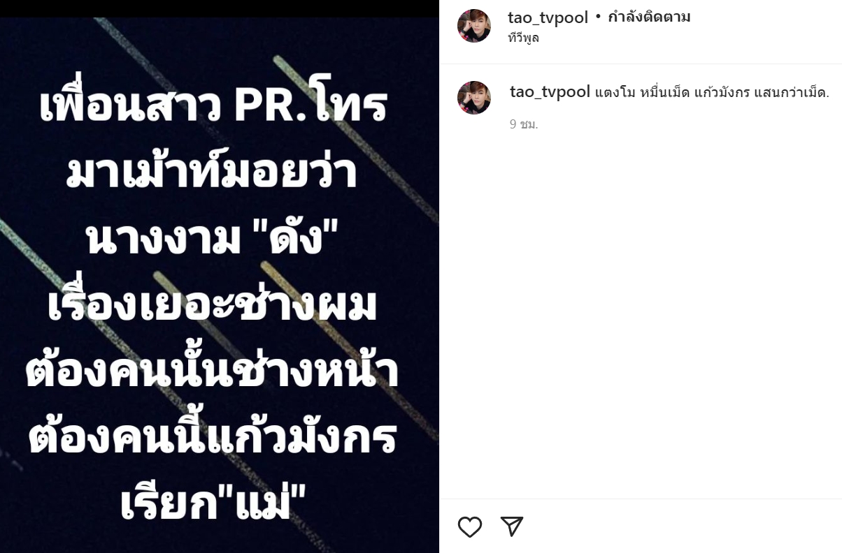 มีเรื่องมาฝากขาเมาท์กันอีกแล้ว โดยรอบนี้เป็นเรื่องของนางงาม ซึ่งล่าสุด (30 กรกฎาคม 2565) เต๋า ทีวีพูล ได้เมาท์ว่า "เพื่อนสาว PR โทร. มาเม้าท์มอยว่า นางงามดังเรื่องเยอะ ช่างผมต้องคนนั้น ช่างหน้าต้องคนนี้ แก้วมังกรเรียกแม่ แตงโม หมื่นเม็ด แก้วมังกร แสนกว่าเม็ด"