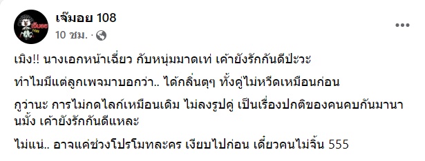 "เมิง !! นางเอกหน้าเฉี่ยว กับหนุ่มมาดเท่ เค้ายังรักกันดีป่ะวะ ทำไมมีแต่ลูกเพจมาบอกว่า.. ได้กลิ่นตุ ๆ ทั้งคู่ไม่หวีดเหมือนก่อน กูว่านะ การไม่กดไลก์เหมือนเดิม ไม่ลงรูปคู่ เป็นเรื่องปกติของคนคบกันมานานมั้ง เค้ายังรักกันดีแหละ ไม่แน่.. อาจแค่ช่วงโปรโมทละคร เงียบไปก่อน เดี๋ยวคนไม่จิ้น 555"