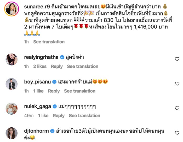 งานนี้ก็มีดาราคนดังและแฟน ๆ เข้ามาร่วมแสดงความยินดีทั้งบอกว่า ดวงเฮงมาก รวมไปถึงหลายคนยังบอกว่างวดหน้าท่าทางจะต้องมาขอเลขเด็ดกันบ้างแล้ว