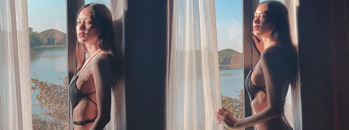 มาพร้อมแคปชั่นยั่วใจไม่เบา ระบุว่า "ไม่มีร่มให้กาง แต่มีร่างให้กอด" โดยยืนโพสท่าแหวกผ้าม่านรับแสงแดดและชมบรรยากาศภายนอก ยิ่งเป็นภาพย้อนแสงบอกเลยว่าเกินต้าน เพราะทั้งแสงและเงากระทบกัน เผยให้เห็นทรวดทรงองค์เอวชัดเจน ส่วนเว้าส่วนโค้งเด่นทุกสัดส่วน แถมเปิดโชว์แผ่นหลังทั้งหมด บิกินี่ช่วงล่างก็จิ๋วมากโชว์ก้นกลมกลึงในเงามืด ยิ่งดูน่าค้นหาไปอีก