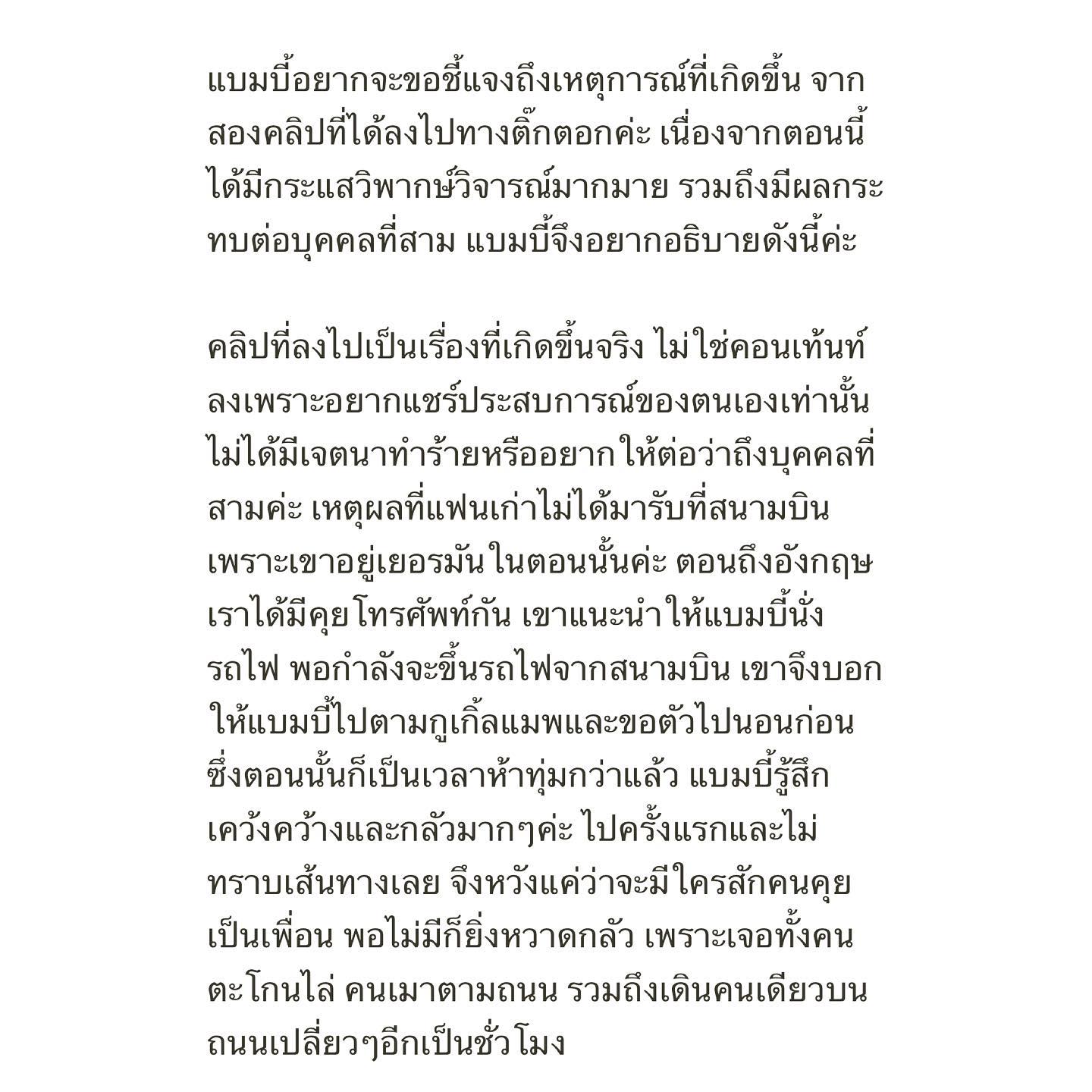 "แบมบี้อยากจะขอชี้แจงถึงเหตุการณ์ที่เกิดขึ้น จากสองคลิปที่ได้ลงไปทาง TikTok ค่ะ เนื่องจากตอนนี้ได้มีกระแสวิพากษ์วิจารณ์มากมาย รวมถึงมีผลกระทบต่อบุคคลที่สาม แบมบี้จึงอยากอธิบายดังนี้ค่ะ
