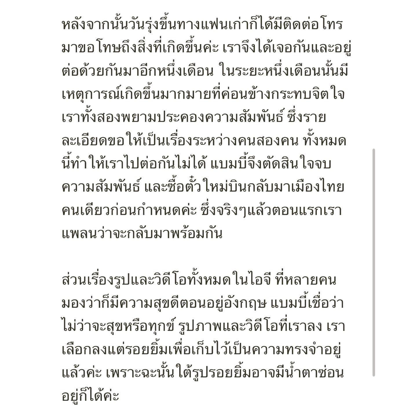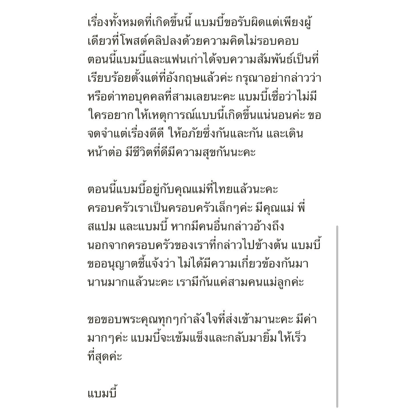 เรื่องทั้งหมดที่เกิดขึ้นนี้ แบมบี้ขอรับผิดแต่เพียงผู้เดียวที่โพสต์คลิปลงด้วยความคิดไม่รอบคอบ ตอนนี้แบมบี้และแฟนเก่าได้จบความสัมพันธ์เป็นที่เรียบร้อยตั้งแต่ที่อังกฤษแล้วค่ะ กรุณาอย่ากล่าวว่าหรือด่าทอบุคคลที่สามเลยนะคะ แบมบี้เชื่อว่าไม่มีใครอยากให้เหตุการณ์แบบนี้เกิดขึ้นแน่นอนค่ะ ขอจดจำแต่เรื่องดีดี ให้อภัยซึ่งกันและกัน และเดินหน้าต่อ มีชีวิตที่ดีมีความสุขกันนะคะ