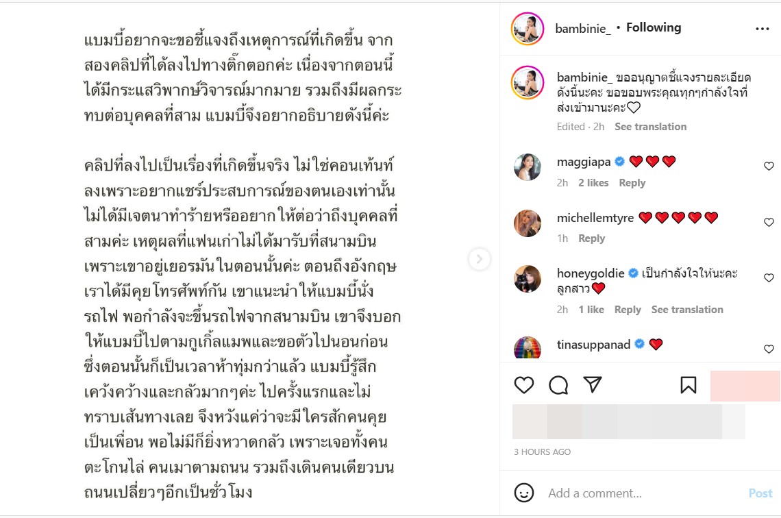 คลิปที่ลงไปเป็นเรื่องที่เกิดขึ้นจริง ไม่ใช่คอนเทนต์ ลงเพราะอยากแชร์ประสบการณ์ของตนเองเท่านั้น ไม่ได้มีเจตนาทำร้ายหรืออยากให้ต่อว่าถึงบุคคลที่สามค่ะ เหตุผลที่แฟนเก่าไม่ได้มารับที่สนามบิน เพราะเขาอยู่เยอรมนีในตอนนั้นค่ะ ตอนถึงอังกฤษเราได้มีคุยโทรศัพท์กัน เขาแนะนำให้แบมบี้นั่งรถไฟ พอกำลังจะขึ้นรถไฟจากสนามบิน เขาจึงบอกให้แบมบี้ไปตามกูเกิ้ลแมปและขอตัวไปนอนก่อน ซึ่งตอนนั้นก็เป็นเวลาห้าทุ่มกว่าแล้ว แบมบี้รู้สึกเคว้งคว้างและกลัวมาก ๆ ค่ะ ไปครั้งแรกและไม่ทราบเส้นทางเลย จึงหวังแค่ว่าจะมีใครสักคนคุยเป็นเพื่อน พอไม่มีก็ยิ่งหวาดกลัว เพราะเจอทั้งคนตะโกนไล่ คนเมาตามถนน รวมถึงเดินคนเดียวบนถนนเปลี่ยว ๆ อีกเป็นชั่วโมง