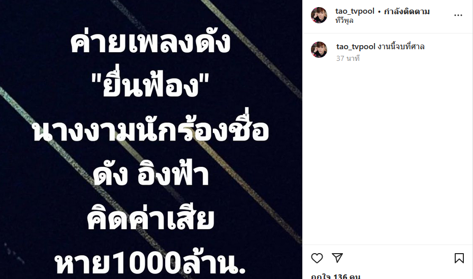 แต่ล่าสุด (24 สิงหาคม 2565) ก็ดูเหมือน อิงฟ้า จะมีงานเข้าเต็ม ๆ หลัง เต๋า ทีวีพูล นักข่าวบันเทิงชื่อดังได้ออกมาโพสต์ข้อความพาดพิงถึงเจ้าตัวว่า "ค่ายเพลงดังยื่นฟ้อง นางงามนักร้องชื่อดัง อิงฟ้า คิดค่าเสียหาย 1,000 ล้านบาท" พร้อมระบุแคปชั่นว่า "งานนี้จบที่ศาล"