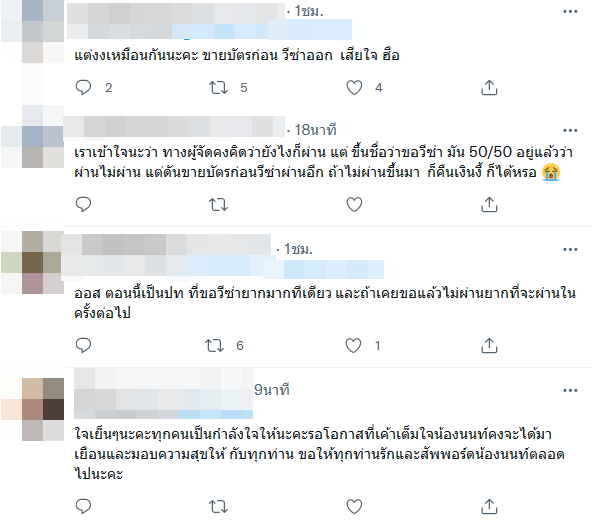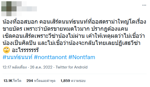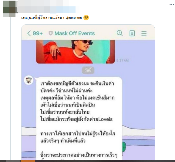 โดยในทวิตเตอร์ได้มีการแชร์ข่าวดังกล่าวอย่างแพร่สะพัด พร้อมแชร์ภาพแชตสนทนาซึ่งคาดว่าน่าจะเป็นกลุ่มแชตของคนที่จะไปร่วมงานดังกล่าวซึ่งระบุว่าจะมีการคืนเงินค่าบัตรคอนเสิร์ต เพราะนนท์วีซ่าไม่ผ่าน ส่วนเหตุผลที่ให้มาคือไม่เชื่อว่านนท์เป็นศิลปิน ไม่เชื่อว่านนท์จะกลับไทย ไม่เชื่อแม้กระทั่งว่าอยู่สังกัดค่าย LOVEiS แม้จะมีการให้เอกสารข้อมูลต่าง ๆ ไปแล้วก็ตาม