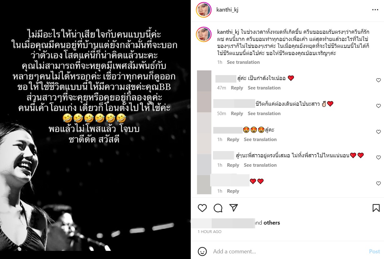 นอกจากนี้ควีนยังลงแคปชั่นด้วยว่า “ในช่วงเวลาทั้งหมดที่เกิดขึ้น ควีนขอยอมรับตรงๆว่าควีนก็รัก ผช. คนนี้มาก ควีนยอมทำทุกอย่างเพื่อเค้า แต่สุดท้ายแล้วอะไรที่ไม่ใช่ของของเราก็ไม่ใช่ของของเราค่ะ ในเมื่อคุณยังหยุดที่จะใช้ชีวิตแบบนี้ไม่ได้ก็ใช้ชีวิตแบบนี้ต่อไปค่ะ ขอให้ชีวิตของคุณบ๊อบเจริญ ๆ ค่ะ”