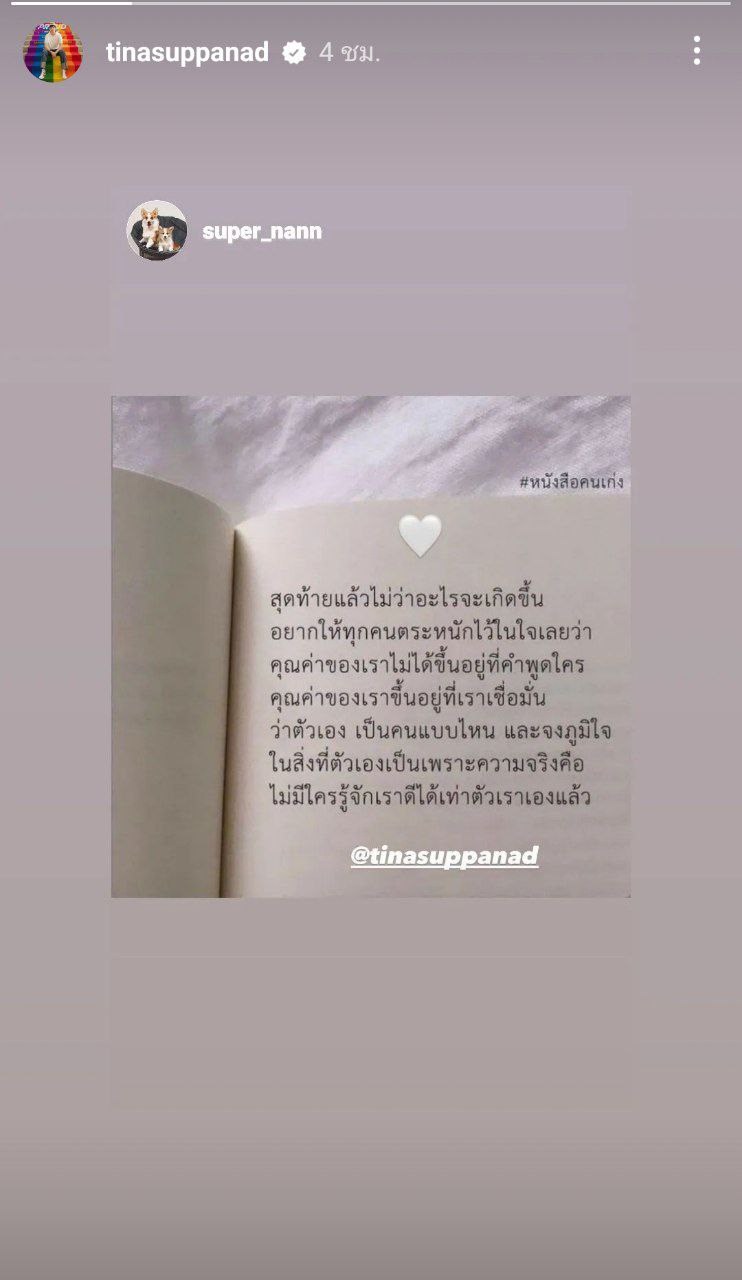ติ๊นา ศุภนาฎ แชร์คำคมลง IG Story หลังเจอทัวร์ลงอย่างหนัก เหตุโดนโยงเป็น ต.น. ที่ ณวัฒน์ ฉะยับ ในดราม่า อิงฟ้า วราหะ คุณค่าของเราไม่ได้อยู่ที่คำพูดใคร