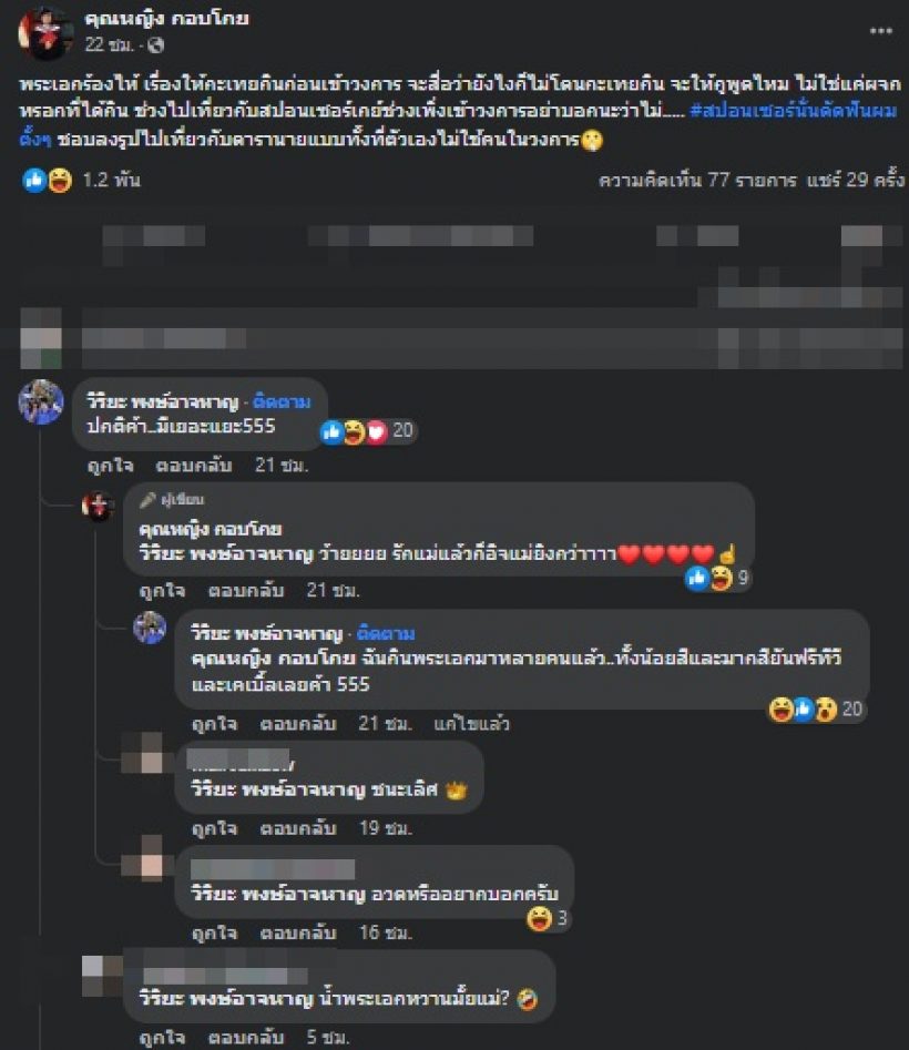 ต่อมา อุ๊บ วิริยะ นักปั้นดาราชื่อดังที่ปั้นดาราในวงการมาแล้วหลายคนก็เข้าไปคอมเมนต์ว่า "ปกติค่า มีเยอะแยะ 555" และ "ฉันกินพระเอกมาหลายคนแล้ว..ทั้งน้อยสีและมากสี ยันฟรีทีวีและเคเบิ้ลเลยค้า 555"