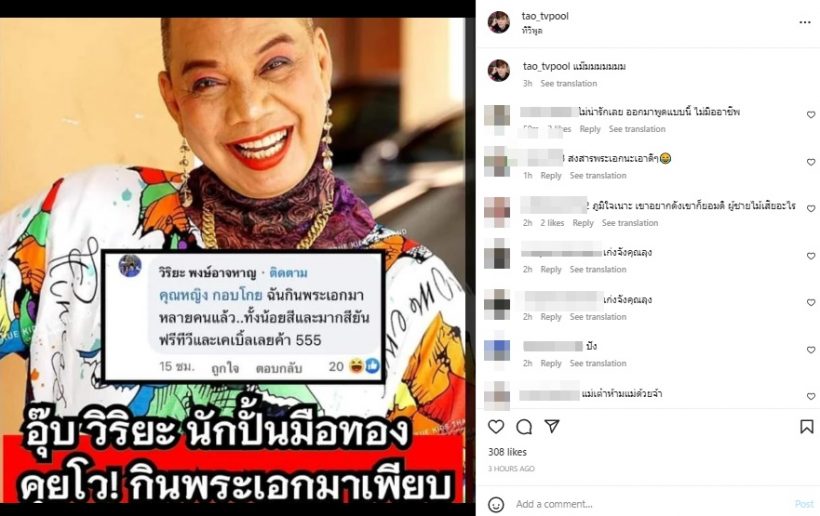 ขณะที่ เต๋า ทีวีพูล ยังได้มีการแชร์คอมเมนต์ดังกล่าวของ อุ๊บ วิริยะ ลงอินสตาแกรมส่วนตัว พร้อมแคปชั่นว่า "แม๊มมมมมม" เล่นเอาขาเมาท์และชาวเน็ตทั้งหลายเมนต์กันสนั่น อยากรู้กันรัว ๆ ว่าอะไร ยังไง !?