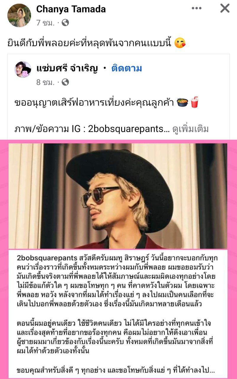 ล่าสุด (5 ตุลาคม 2565) ไฮโซสาว ชัญญ่า ทามาดะ ก็เป็นอีกหนึ่งคนที่ออกมาโพสต์ถึงเรื่องนี้ด้วย โดยได้แชร์โพสต์ที่ ทู ออกมายอมรับผิดว่าได้นอกใจ สาวพลอย มีมือที่สามจริง ๆ แถม สาวชัญญ่า ยังระบุข้อความสุดแซ่บซี้ดไว้อีกว่า "ยินดีกับพี่พลอยค่ะที่หลุดพ้นจากคนเเบบนี้"