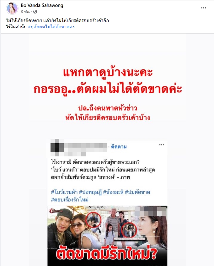 โบว์ แวนด้า เดือดจัด เจอพาดหัวข่าวแรง บอกตัดขาดครอบครัว ปอ ทฤษฎี ตอบปมมีรักใหม่ ลั่นแหกตาดูบ้าง กูตัดผม ไม่ได้ตัดขาด หัดให้เกียรติครอบครัวเขาบ้าง