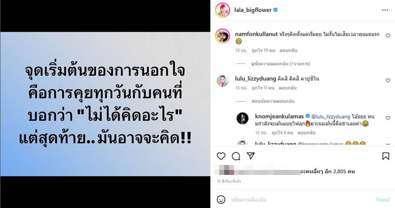 โดย ลาล่า ระบุว่า "จุดเริ่มต้นของการนอกใจ คือการคุยทุกวันกับคนที่บอกว่า "ไม่ได้คิดอะไร" แต่สุดท้าย...มันอาจจะคิด"