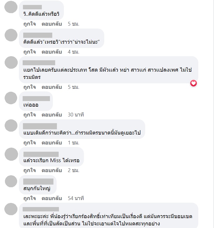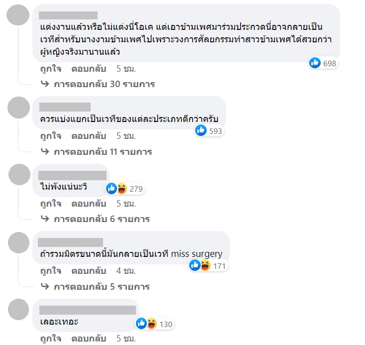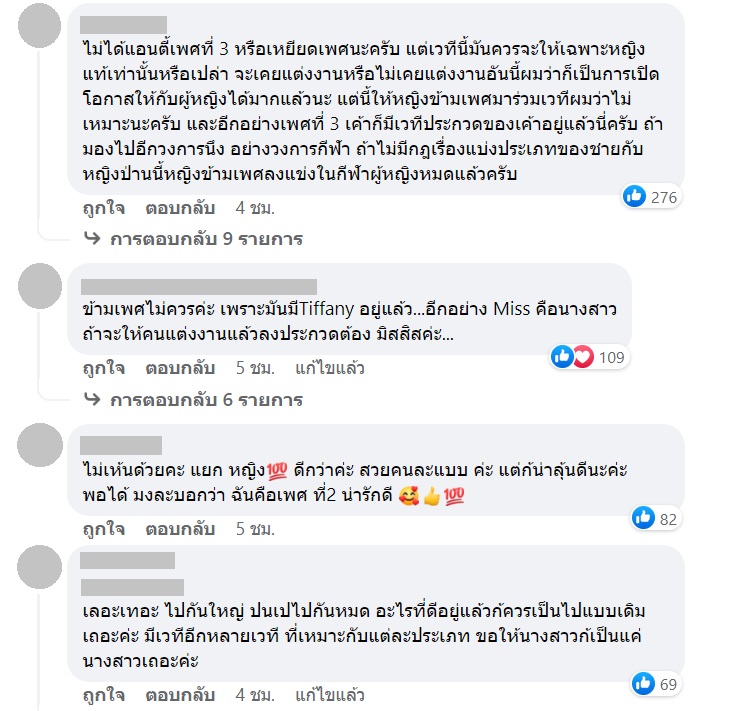 อย่างไรก็ตาม หลายคนสนับสนุนแนวคิดนี้ แต่อีกหลายคนมองว่าควรแยกเวทีและประเภทของการประกวดจะดีกว่า เรื่องที่ว่าจะให้ผู้หญิงที่แต่งงานแล้วหรือหย่าร้างมาประกวดก็คิดว่าเปิดโอกาสให้ผู้หญิงได้มากแล้ว ส่วนสาวข้ามเพศก็มีเวทีประกวดอยู่แล้ว ถ้านำมารวมมิตรกันแบบนี้อาจจะยิ่งเละเทะไปกันใหญ่ เพราะแต่ละเวทีก็มีความเหมาะสมกับแต่ละประเภท