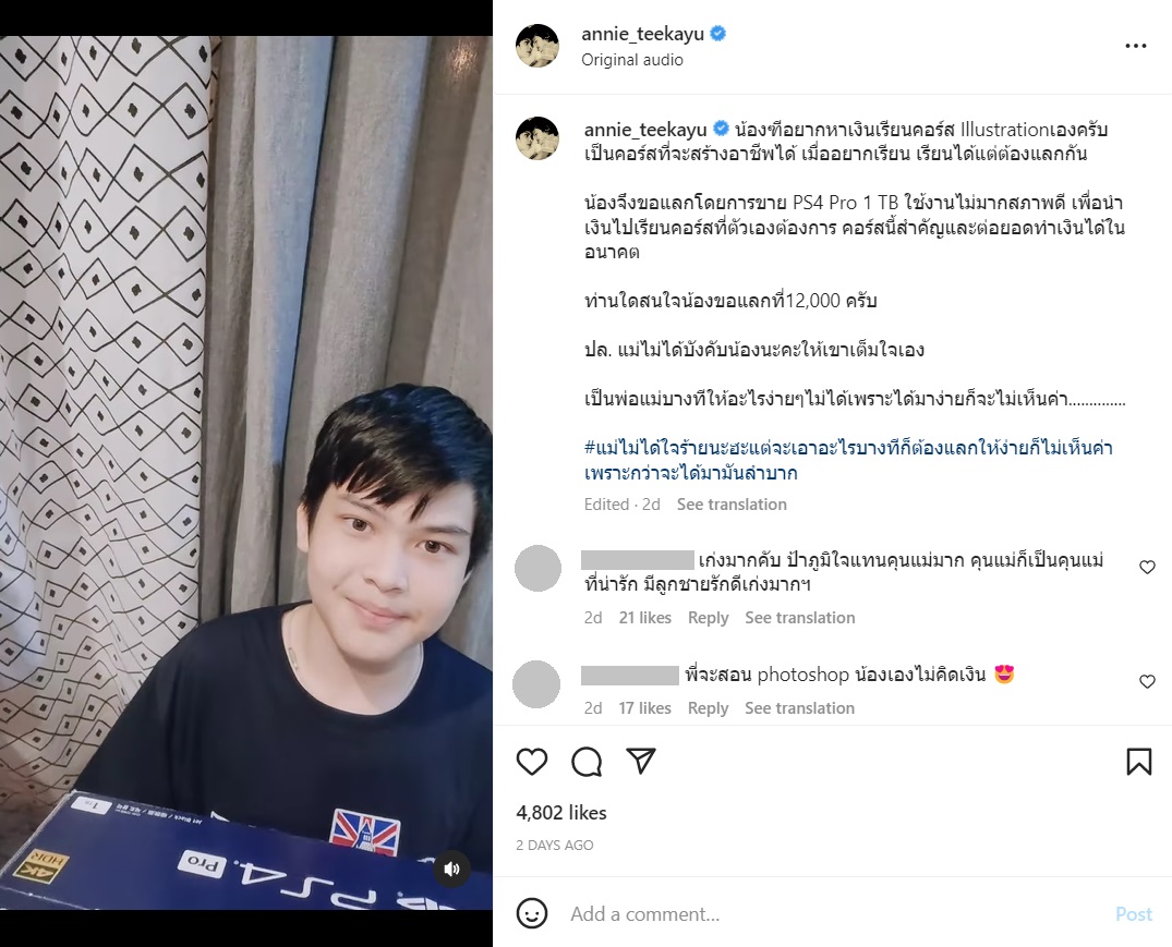 ขณะที่คุณแม่แอนนี่ ได้เขียนข้อความบรรยายเอาไว้ด้วยว่า "น้องฑีอยากหาเงินเรียนคอร์ส Illustration เองครับ เป็นคอร์สที่จะสร้างอาชีพได้ เมื่ออยากเรียน เรียนได้ แต่ต้องแลกกัน น้องจึงขอแลกโดยการขาย PS4 Pro 1 TB ใช้งานไม่มาก สภาพดี เพื่อนำเงินไปเรียนคอร์สที่ตัวเองต้องการ คอร์สนี้สำคัญและต่อยอดทำเงินได้ในอนาคต ท่านใดสนใจน้องขอแลกที่ 12,000 ครับ