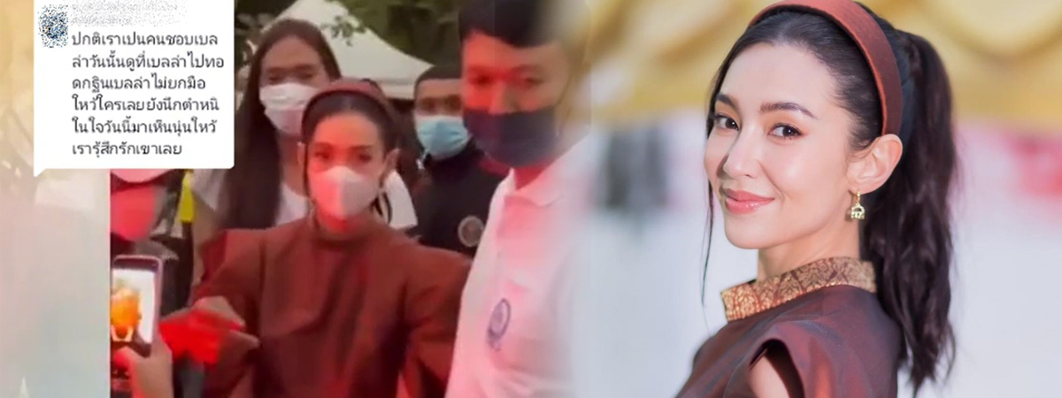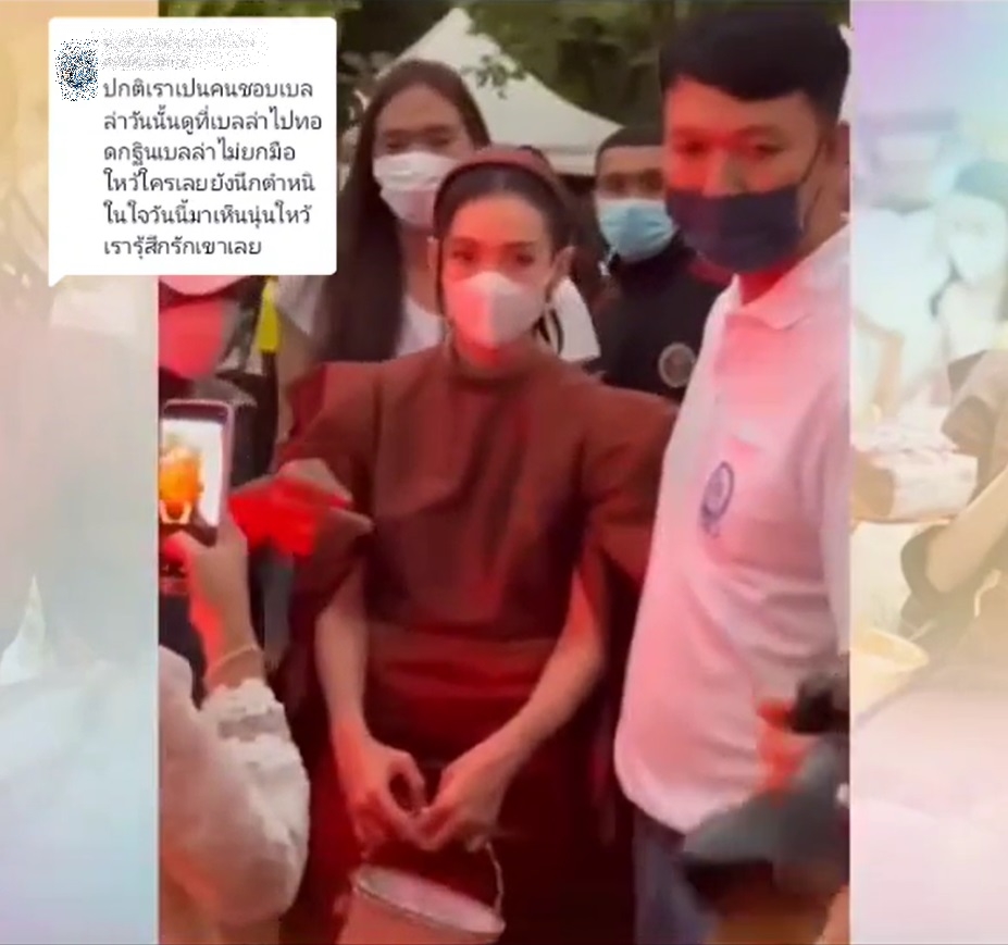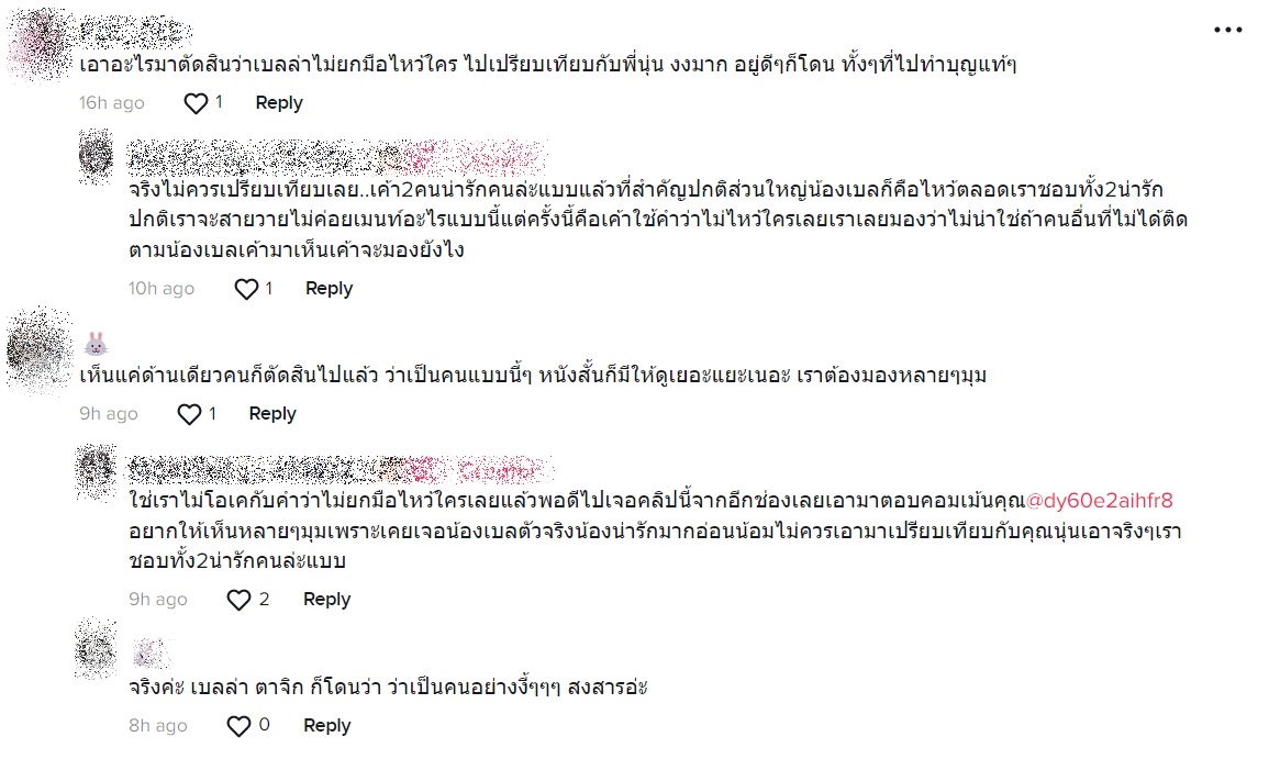 จากนั้นก็มีคนเข้ามาโต้ตอบชาวเน็ตรายดังกล่าวว่า เอาอะไรมาตัดสินว่าเบลล่าไม่ยกมือไหว้ใคร ทั้งยังยกไปเปรียบเทียบกับนุ่นอีก รู้สึกงงมาก อยู่ดี ๆ ก็โดนดราม่า ทั้งที่ไปทำบุญแท้ ๆ พร้อมนำภาพในมุมอื่น ๆ ที่สาวเบลล่ายกมือไหว้พ่อแม่พี่น้องที่ยืนมุงถ่ายรูปมาให้ดู ก็เห็นว่าเบลล่ายิ้มและยกมือไหว้อย่างนอบน้อม จึงติงชาวเน็ตที่ดราม่าว่าไม่ควรตัดสินใครจากที่เห็นแค่ด้านเดียว เพราะอีกฝ่ายจะเสียหายได้