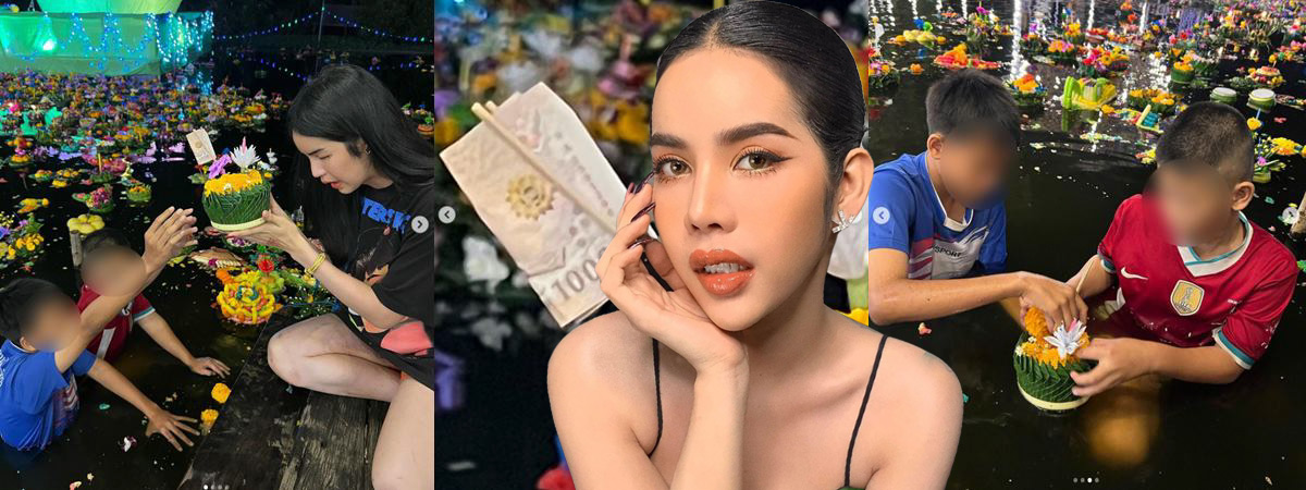โดยที่นารา ได้เผยภาพตอนกำลังนั่งอธิษฐานขอพรกับกระทง แต่นอกจากกระทงแล้ว สิ่งที่สะดุดตาสุด ๆ คงเป็นเงินแบงก์พันที่หนีบใส่ไม้ ชูสว่างไสวยิ่งกว่าธูปเทียน จนเด็กเก็บกระทงห้ามใจไม่ไหว รีบชูมือมาคว้าก่อนที่กระทงจะแตะถึงน้ำซะอีก