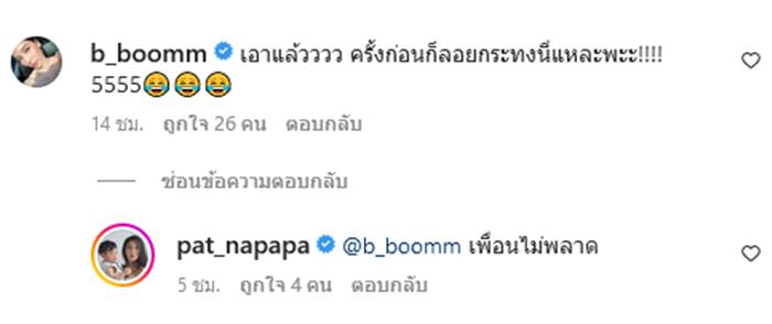 ทำเอาหลายคนสงสัยว่าสาวแพทนั้นไปลอยกระทงกับใครเอ่ย เพราะเมื่อปีที่แล้วเจ้าตัวก็ควงอดีตแฟนหนุ่มตำรวจมาเปิดตัวช่วงวันลอยกระทงนี่แหละค่ะ งานนี้ไม่เพียงแต่ขาเมาท์และแฟน ๆ ที่สงสัยเพราะเพื่อนสาวอย่าง บูม สุภาพร ยังเข้าไปคอมเมนต์แซวด้วยว่า "เอาแล้วววว ครั้งก่อนก็ลอยกระทงนี่แหละพะะ !!!! 5555" ซึ่งสาวแพทก็เข้ามาตอบว่า "เพื่อนไม่พลาด"