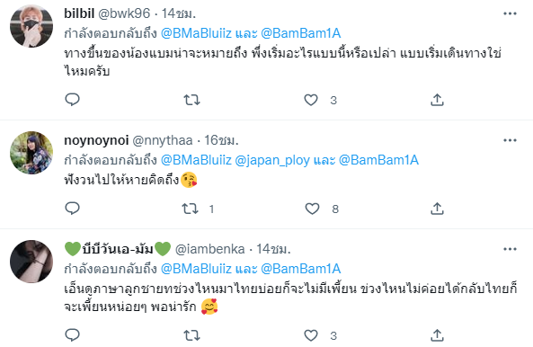 โดยแบมแบมก็บอกว่าให้มดดำนั้นรีบบินไปเกาหลีจะได้ไปกินหมูกระทะด้วยกัน และเมื่อถูกถามว่าเมื่อไรจะกลับมาไทย แบมแบมก็เผยว่าจริง ๆ มีงานที่ไทยแต่ยังบอกไม่ได้ว่าเป็นงานอะไรเพราะงานยังไม่เปิดเผยออกมา แต่ว่าเป็นในเร็ว ๆ นี้แน่นอน พร้อมกับพูดฝากผลงานและบริษัทของพี่ชายด้วย