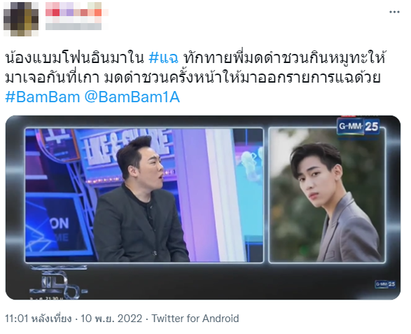 อย่างล่าสุด (10 พฤศจิกายน 2565) แบมแบม ก็ได้โฟนอินเข้ารายการ แฉ ทางช่อง GMM25 พร้อมช่วยโปรโมตผลงานให้กับพี่ชาย ก็โดน มดดำ คชาภา พิธีกรรายการถามไถ่ถึงเรื่องที่เคยจะชวนกินข้าวด้วยกัน ซึ่งแบมแบมเคยชวนให้ไปกินหมูกระทะด้วยกัน