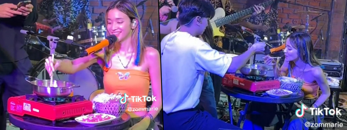 นักร้องสาวยังลงแคปชั่นฮา ๆ ไว้อีกว่า "เมื่อมีแฟนคลับสั่งหมูจุ่มมาให้ ก็ร้องไปกินไปเลยดิค้าบ แซ่บคักกกกก #zommarie #ส้มมารี #นครพนม"