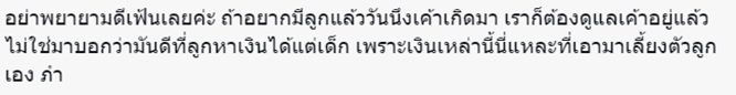 งานนี้ก็เหมือนงานจะเข้าไปที่ตุ๊กกี้แทน เพราะหลายคนถามว่า การหาเงินเป็นหน้าที่ของเด็กตั้งแต่เมื่อไร การที่ตุ๊กกี้พูดแบบนี้ อาจจะทำให้คนเข้าใจผิด เป็นการมองว่าลูกเป็นสมบัติของพ่อแม่ ต้องมีลูกไว้ทันใช้ แต่ถามความสมัครใจลูกหรือเปล่าว่าอยากทำหรือเปล่า การหาเงินเป็นหน้าที่ของพ่อแม่ ไม่ใช่ของลูก