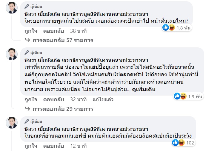 นอกจากนี้ ทนายตั้ม ยังคอมเมนต์ใต้โพสต์ด้วยว่า "ใครบอกทนายพูดเกินไปนะครับ เจอกล้องวงจรปิดเข้าไป หน้าสั่นเลยไหม ? เท่าที่ผมทราบคือ น้องเขาไม่แฮปปี้อยู่แล้ว เพราะไม่ได้สนิทอะไรกันขนาดนั้น แต่ก็ถูกบุคคลในคลิปจิกใช้เหมือนคนรับใช้ตลอดทริป ใช้ถือของ ใช้ทำนู่นทำนี่ พอไม่พอใจก็โวยวาย แต่ก็ไม่คิดว่าจะกล้าทำร้ายกันกลางห้างต่อหน้าคนมากมาย เพราะแค่เหนื่อย ไม่อยากไปกินปูด้วย ทีหลังถ้าอยากสบายขนาดนั้น พาเด็กที่บ้านไปช่วยถือของนะครับ จะได้ไม่เป็นภาระคนอื่น"