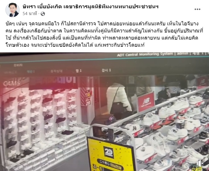 "ชัด ๆ เน้นๆ จุดจบคนมือไว ก็ไปสถานีตำรวจ ไปศาลบ่อยหน่อยแล้วกันนะครับ เห็นในไอจีบางคนลงเรื่องเกลือกับน้ำตาล ในความคิดผมทั้งคู่มันก็มีความสำคัญไม่ต่างกัน ขึ้นอยู่กับปริมาณที่ใช้ ที่น่ากลัวไม่ใช่สองสิ่งนี้ แต่เป็นคนที่ทำผิด ทำพลาดหลายต่อหลายหน แต่กลับไม่เคยคิดโทษตัวเอง จนจะเข้าวัยแซยิดยังคิดไม่ได้ แก่เพราะกินข้าวโดยแท้"