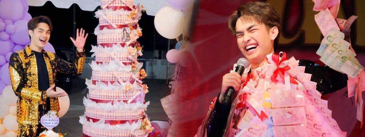 โดยงานนี้แม่ยกเปย์กันหนักมาก จัดใหญ่ด้วยการยกเค้กที่ทำจากเงินเรียงกันสูงกว่าตัวคนมาให้ เท่านั้นยังไม่พอ มีการทำพวงมาลัยเงินมาให้อีกจนห้อยคอไม่หมด ถึงขนาดต้องยกไปแขวนกับราวกันเลยทีเดียว