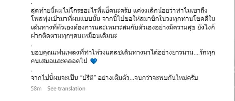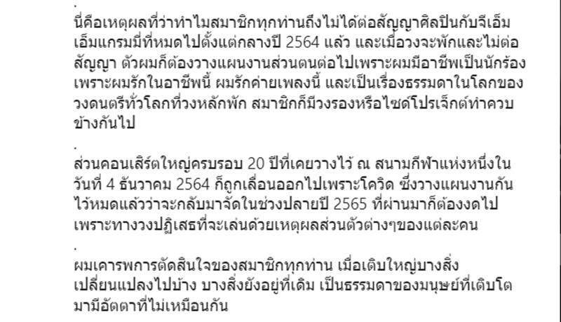 “สุดท้ายนี้ผมไม่โกรธอะไรพี่แฮ็คนะครับ แค่งงเล็กน้อยว่า ทำไมเขาถึงโพสต์ พุ่งเป้ามาที่ผมแบบนั้น จากนี้ไปขอให้สมาชิกในวงทุกท่านโชคดีในเส้นทางที่ตัวเองต้องการ และเหมาะสมกับตัวเองอย่างมีความสุข ยังไงก็ฝากติดตามทุก ๆ คนเหมือนเดิมนะ