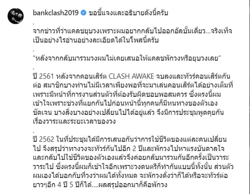 ล่าสุด แบงค์ได้ออกมาเผยในไอจีส่วนตัวว่า หลังจากที่กลับมารวมวงกันอีกครั้ง ตนไม่เคยเสนอให้มีการยุบวงหรือพักวงเลย พร้อมกับแถลงเป็นไทม์ไลน์ของวงแคลชหลังจากกลับมารวมตัวกันอีกครั้ง
