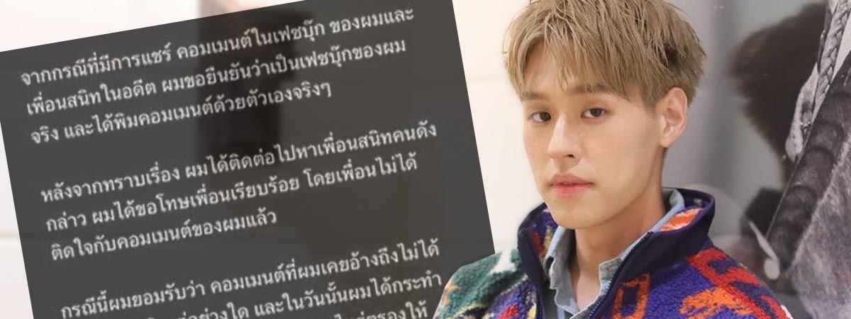 โดยระบุว่า "จากกรณีที่มีการแชร์ คอมเมนต์ในเฟซบุ๊ก ของผมและเพื่อนสนิทในอดีต ผมขอยืนยันว่าเป็นเฟซบุ๊กของผมจริง และได้พิมพ์คอมเมนต์ด้วยตัวเองจริง ๆ หลังจากทราบเรื่อง ผมได้ติดต่อไปหาเพื่อนสนิทคนดังกล่าว ผมได้ขอโทษเพื่อนเรียบร้อย โดยเพื่อนไม่ได้ติดใจกับคอมเมนต์ของผมแล้ว