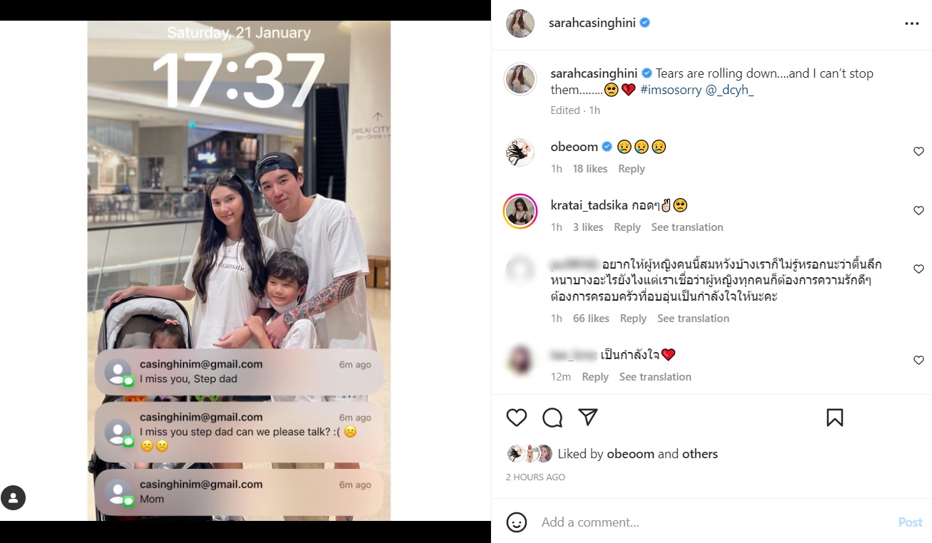 นอกจากนี้ ซาร่า ยังได้แท็กหาชื่อ IG ที่คาดว่าเป็นของ ดาริล ยัง อีกด้วย ซึ่งก็มีหลายคนเข้ามาคอมเมนต์ให้กำลังใจนางแบบสาวด้วย