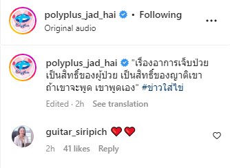 ล่าสุด (1 กุมภาพันธ์ 2566) ในอินสตาแกรม polyplus_jad_hai ก็ได้เผยคลิปในรายการ ข่าวใส่ไข่ ที่พิธีกร หนุ่ม กรรชัย พูดกับ มดดำ คชาภา เกี่ยวกับเรื่องนี้ว่า เรื่องบางเรื่องเขาไม่ควรจะออกมาพูด มดดำทำถูกแล้ว เรื่องของอาการเจ็บป่วยมันควรออกมาพูดที่ไหน มันคือสิทธิ์ของผู้ป่วย เป็นสิทธิ์ของญาติ คุณพูดถูกแล้ว มันไม่ควรออกมาพูด อันนี้สิ่งสำคัญ